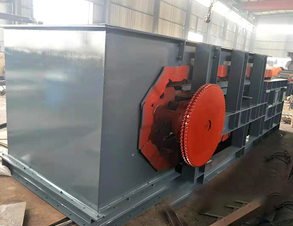 鏈板式喂料機采用節(jié)距為228.6mm(9吋)的高強度推土機模鍛鏈條為牽引件,兩根鏈條繞過安裝在機體頭部的一對驅(qū)動鏈輪和機體尾部的一對張緊輪聯(lián)成封閉形回路,在兩排鏈條的每個鏈節(jié)上裝配了相互交迭的、重型結(jié)構(gòu)的輸送槽而成為一個連續(xù)的能夠運載物料的輸送線路。其自重和物料的重量由安裝在機體上的多排支重輪、鏈托輪和滑道梁支承。傳動系統(tǒng)經(jīng)交流變頻調(diào)速電動機聯(lián)接減速機,再由漲套與驅(qū)動裝置直聯(lián)驅(qū)動運載機構(gòu)低速運行。將尾部料倉卸入的物料沿輸送線路運至機體的前方排出,實現(xiàn)向下方的工作機械連續(xù)均勻喂料的目的。