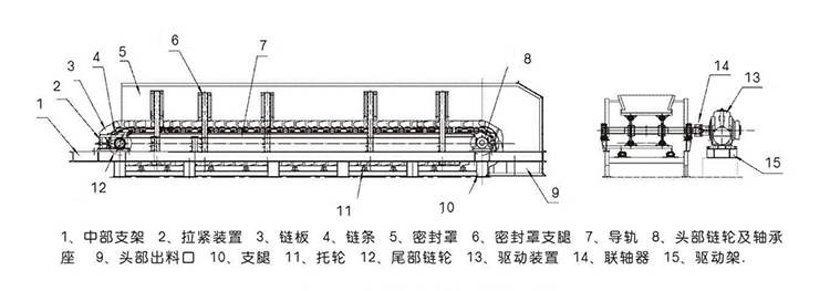 電動機(jī)啟動后經(jīng)減速裝置減速,經(jīng)過聯(lián)軸器將動力傳到主動軸上,主動軸上的鏈輪帶動鏈輪轉(zhuǎn)動,同時頭尾裝置中與鏈輪相咬合的鏈條隨主副鏈輪轉(zhuǎn)動,