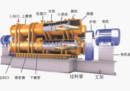 振動(dòng)磨機(jī)由雙圓筒依靠聯(lián)接板固定成一體,聯(lián)接板上同時(shí)固定著激振器,且激振器需通水冷卻,雙圓筒由隔振彈簧支承,彈簧支座固定在不參振的底架上。由電動(dòng)機(jī)通過撓性聯(lián)軸器和萬向聯(lián)軸器帶動(dòng)激振器的軸旋轉(zhuǎn),激振器的軸上帶有偏心塊,由于帶偏心塊軸的旋轉(zhuǎn)使雙圓筒做近似的圓振動(dòng)。筒體內(nèi)充填研磨介質(zhì)(鋼球或鋼棒)和待粉磨物料,物料既可從上圓筒的進(jìn)料口進(jìn)入,上圓筒內(nèi)粉磨完畢的物料流入下圓筒繼續(xù)粉磨,最后從下圓筒的出料口排出,即單進(jìn)單出;物料也可同時(shí)進(jìn)入上下圓筒進(jìn)行粉磨,然后同時(shí)排出,即雙進(jìn)雙出或雙進(jìn)四出。筒體做圓振動(dòng)時(shí),筒內(nèi)的介質(zhì)和物料在筒內(nèi)翻轉(zhuǎn),互相沖擊,這種有規(guī)律的翻轉(zhuǎn)、沖擊和介質(zhì)的自轉(zhuǎn),使物料在短時(shí)間內(nèi)得到粉碎,并達(dá)到理想的粉碎效果,圓筒筒體由外筒、內(nèi)襯筒和端蓋組成。內(nèi)襯筒是可更換的,由耐磨材料制成。 ZM系列振動(dòng)磨的激振器由四組主副偏心塊組成,調(diào)整副偏心塊和主偏心塊的相位角,可改變激振力的大小,從而達(dá)到調(diào)整振幅大小的目的,振動(dòng)磨雙振幅的近似值可以從振幅標(biāo)示牌上讀出。圓筒內(nèi)的粉磨介質(zhì)有鋼球或鋼棒兩種。相同直徑和級(jí)配的情況下,鋼棒做介質(zhì)時(shí)的產(chǎn)率要高于鋼球做介質(zhì)時(shí)的產(chǎn)率。因?yàn)橛娩撉蜃鼋橘|(zhì)時(shí),要達(dá)到同樣的粉狀粒度,粉磨時(shí)間較長,但鋼球做介質(zhì)時(shí)能達(dá)到更細(xì)的粒度。振動(dòng)磨常用介質(zhì)為Φ16-Φ36mm的鋼棒,鋼棒應(yīng)經(jīng)過滲碳和淬火,表面硬度應(yīng)達(dá)到HRC55以上。入料粒度>15mm時(shí)取較大直徑,入料粒度<15mm時(shí)取較小直徑,并采用兩種不同直徑鋼棒的混合級(jí)配較好。