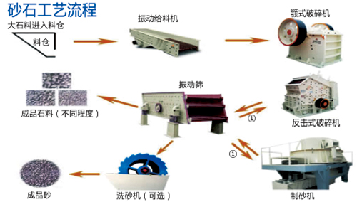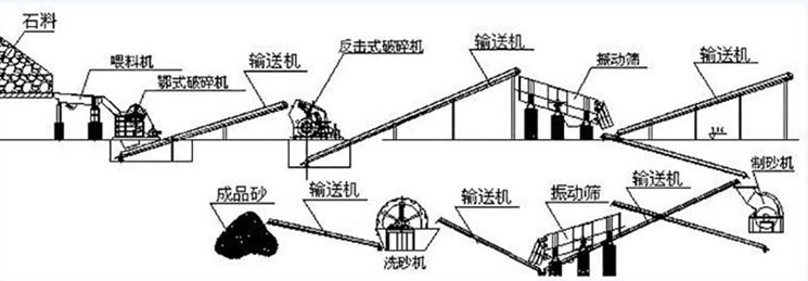 制砂生產(chǎn)線在工作過(guò)程中,大塊石料經(jīng)料倉(cāng)由振動(dòng)給料機(jī)均勻地送進(jìn)顎式破碎機(jī)進(jìn)行粗碎,粗碎后的石料由膠帶輸送機(jī)送入圓錐破碎機(jī)(或反擊式破碎機(jī))進(jìn)行中碎,中碎后的石料由膠帶輸送機(jī)送進(jìn)振動(dòng)篩進(jìn)行篩分,成品砂子(篩下物)由膠帶輸送機(jī)送至洗砂機(jī)清洗后再通過(guò)膠帶輸送機(jī)送至成品料堆;大顆粒石料(篩上物)由膠帶輸送機(jī)送至立式?jīng)_擊破碎機(jī)(制砂機(jī))進(jìn)行細(xì)碎,細(xì)碎后的石料由膠帶輸送機(jī)再次送進(jìn)振動(dòng)篩進(jìn)行篩分,這樣形成閉路多次循環(huán)。