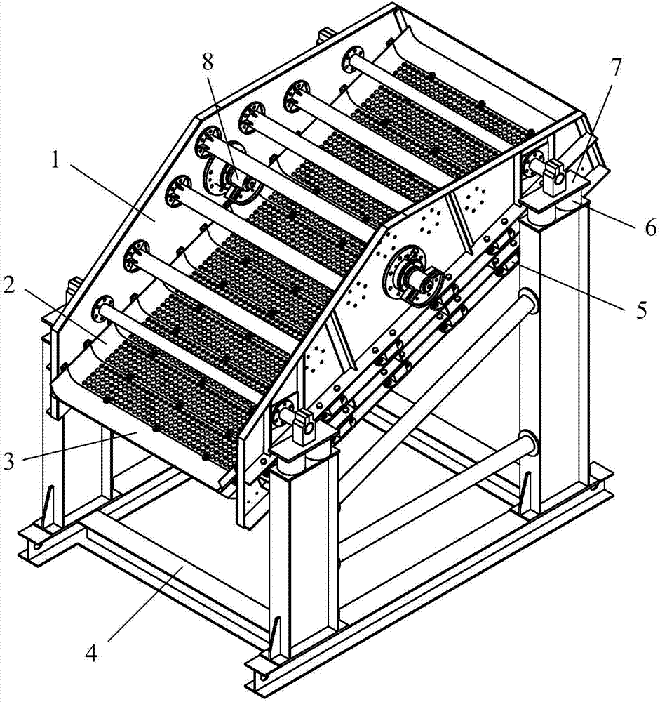 弛張篩是我廠生產(chǎn)的一種新型篩分機(jī)械。該機(jī)采用雙質(zhì)體亞共振原理,通過傾斜篩箱上安裝的彈性篩面的弛、張運(yùn)動(dòng)拋擲物料的篩分機(jī)。其主要特點(diǎn)是篩分效率提高,處理量大,動(dòng)負(fù)荷小,功耗少,噪聲低,因此應(yīng)用較為廣泛。在這個(gè)過程中,彈性聚氨酯篩面以每分鐘800次的頻率連續(xù)不斷地?cái)U(kuò)張、收縮,從而獲得很高的加速度(50g),有效地防止了篩孔堵塞。