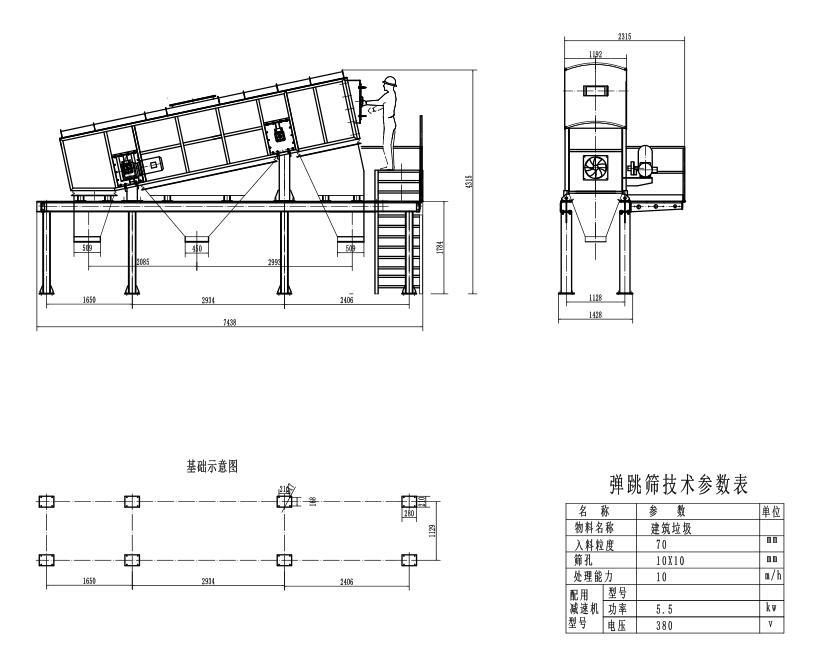 運行垃圾分選彈跳篩前檢查:包括設(shè)備衛(wèi)生,各部位連接螺栓齊全、緊固、完好,檢查激振器是否完好,檢查各彈簧 有無損壞、缺少、斷裂等現(xiàn)象,檢查三角帶是否張緊有無斷裂篩箱、篩板有無損壞,檢查篩板有無雜物堵塞篩面要平整無損壞、松動現(xiàn)象,檢查進出料溜槽是否暢通檢查橫梁有無開焊等現(xiàn)象,檢查安全防護裝置是否安全可靠,檢查控制箱、通訊、照明是否完好,接地保護是否可靠,控制按鈕是否靈活可靠。啟動時:開啟垃圾分選彈跳篩后,站在控制箱旁監(jiān)視設(shè)備起動發(fā)現(xiàn)異常立即停機。啟動正常后再次巡查每臺垃圾分選彈跳篩的噴嘴有無堵塞或脫落,經(jīng)常觀察電動機的溫度和聲音,經(jīng)常觀察激振器的聲音,觀察篩子的振動情況四角振幅是否一致有無漏煤現(xiàn)象三角帶是否松動或脫落,經(jīng)常觀察脫水脫介效果。檢查篩子入出料情況是否正常有無堵塞。
