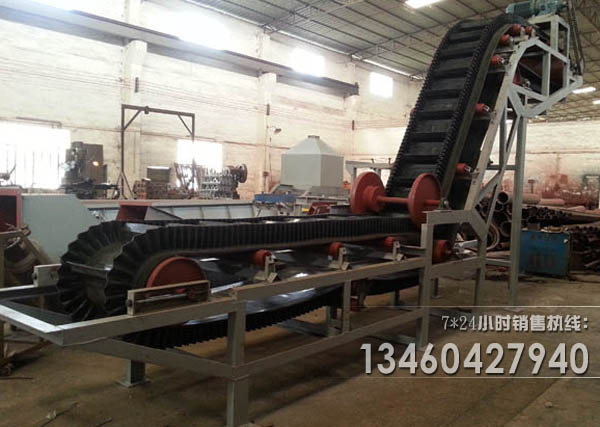 a)大傾角擋邊皮帶輸送機(jī)工作原理就是在平面的輸送上面分成一格一格的,在皮帶中間焊有一條條的擋板,在皮帶的兩邊焊的波狀擋邊形成一體,用來輸送散料;