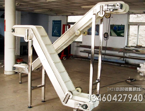 b)擋邊皮帶輸送機(jī)用于斜坡輸送,可以把低處產(chǎn)品提升到一定的高度,用于物料提升,在提升的過程中,可以將散料放在一格一格里面,在傾斜的角度中,不會滑;